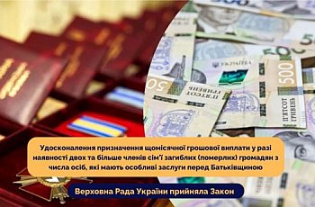Парламент прийняв Закон щодо удосконалення призначення щомісячної грошової виплати у разі наявності двох та більше членів сім’ї загиблих (померлих) громадян з числа осіб, які мають особливі заслуги перед Батьківщиною