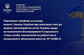 Верховна Рада України підтримала законопроект щодо встановлення безперервності страхового стажу особи, поновленої на роботі після незаконного звільнення