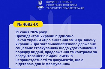 Президентом України підписано Закон України «Про внесення змін до Закону України «Про загальнообов’язкове державне соціальне страхування» щодо удосконалення порядку видачі, продовження та контролю за обґрунтованістю видачі листків непрацездатності та документів, що є підставою для їх формування»