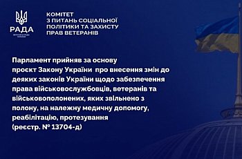 Парламент підтримав законопроект щодо забезпечення права військовослужбовців, ветеранів та військовополонених, яких звільнено з полону, на належну медичну допомогу, реабілітацію, протезування