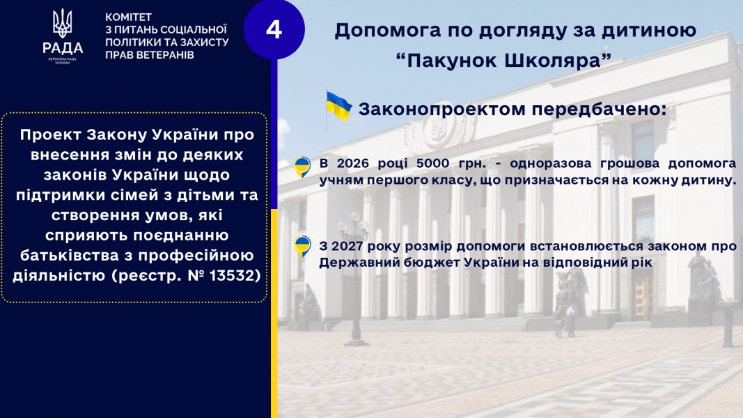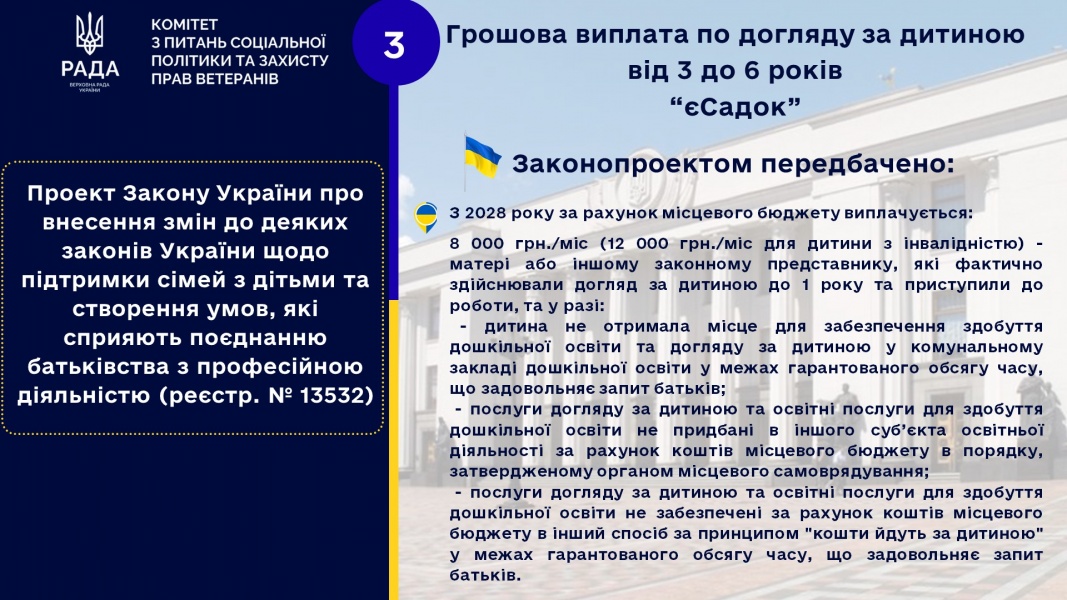 4. Комітет пропонує підтримати нову законодавчу пропозицію Голови Комітету щодо запровадження з 2028 року щомісячної грошової виплати «єСадок» за рахунок коштів місцевого бюджету для забезпечення догляду за дитиною від трьох до шести років (дитина з особливими потребами – до семи (восьми) років) у разі, якщо: