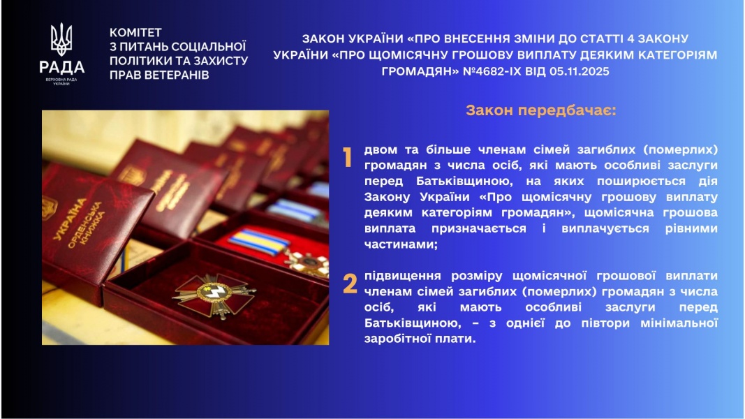 Комітет повідомляє, що 9 лютого 2026 року Президентом України підписано Закон України «Про внесення зміни до статті 4 Закону України “Про щомісячну грошову виплату деяким категоріям громадян”» № 4682-ІХ від 05.11.2025.