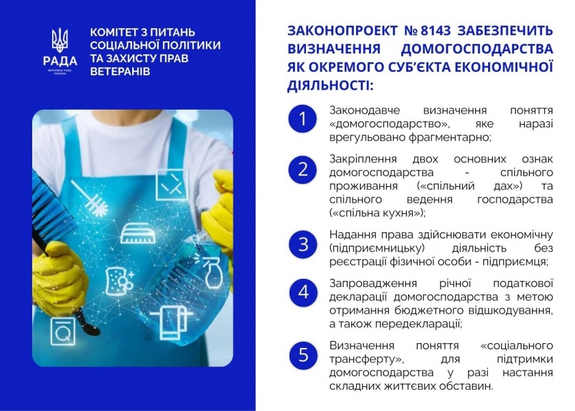 На розгляд Верховної Ради України у першому читанні очікує законопроєкт про свободу підприємницької (економічної) діяльності домогосподарств (реєстр. № 8143).