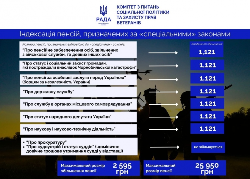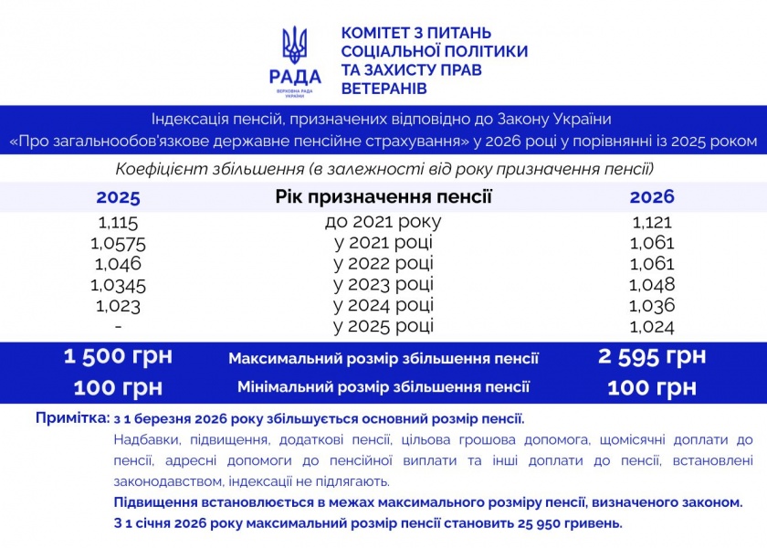З 1 березня проведено індексацію пенсій та страхових виплат із застосуванням коефіцієнта 1,121 (12,1 %), що забезпечило підвищення розмірів відповідних виплат відповідно до чинного законодавства.