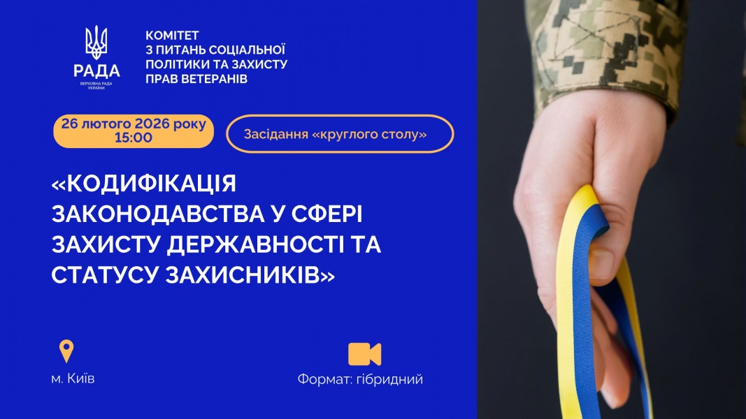 26 лютого 2026 року планується проведення засідання «круглого столу» на тему: «Кодифікація законодавства у сфері захисту державності та статусу захисників» під головуванням заступника Голови Комітету Тарасенка Т. П. у змішаному форматі (з використанням режиму відеоконференції на платформі ZOOM).