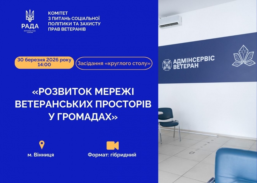 30 березня 2026 року у м. Вінниця планується проведення засідання «круглого столу» на тему: «Розвиток мережі ветеранських просторів у громадах» під головуванням голови підкомітету з питань соціального захисту прав ветеранів Комітету Остапенка А.Д. у змішаному форматі (з використанням режиму відеоконференції на платформі ZOOM).