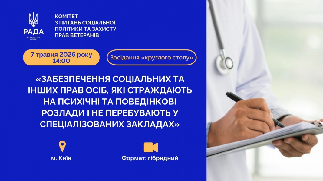 7 травня 2026 року планується проведення засідання «круглого столу» на тему: «Забезпечення соціальних та інших прав осіб, які страждають на психічні та поведінкові розлади і не перебувають у спеціалізованих закладах» під головуванням голови підкомітету з питань соціального захисту дітей, постраждалих внаслідок збройної агресії Російської Федерації проти України з 2014 року, Комітету Циби Т.В. у змішаному форматі (з використанням режиму відеоконференції на платформі ZOOM).